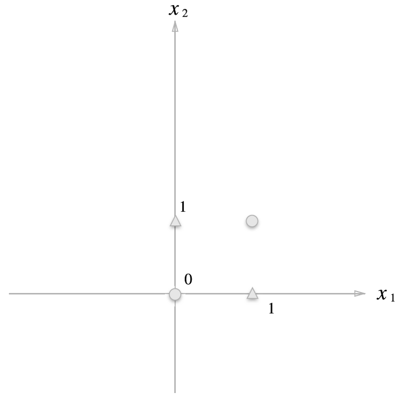 그러나 XOR은 직선 하나만 그어서는 동그라미와 세모를 나눌 수 없습니다. XOR은 $(0, 0), (1, 1)$의 값은 0, $(1, 0), (0, 1)$ 값은 1이기 때문입니다.