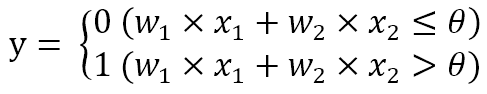 퍼셉트론은 입력으로 받은 신호에 각각 가중치를 곱한 값이, 임계값($\theta$)를 초과하면 1, 임계값 이하이면 0을 출력합니다. 따라서 이는 간단한 형태의 이진 분류기(Binary Classificator)로 볼 수 있습니다.