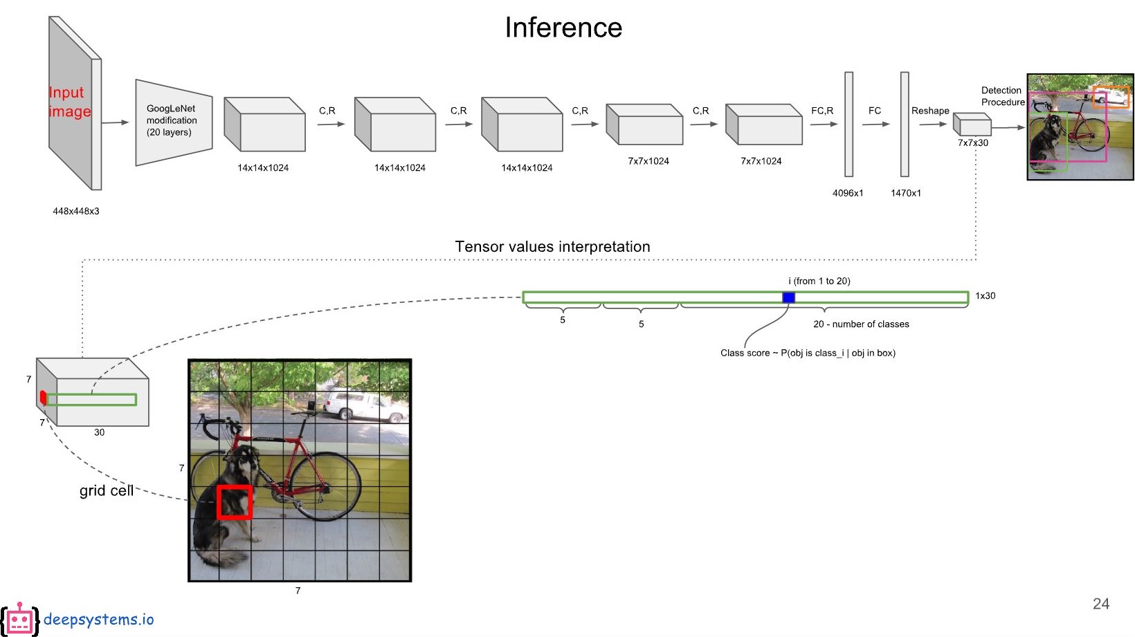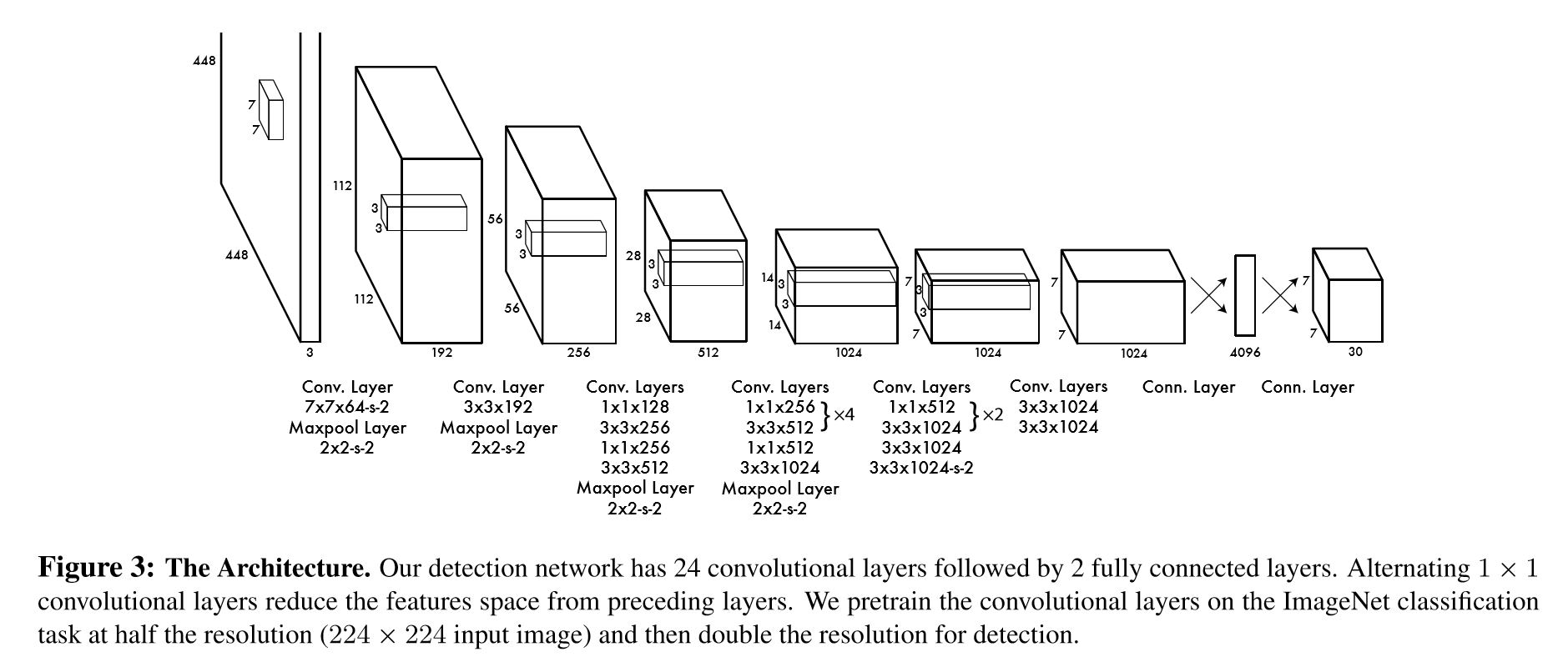 YOLO는 GoogleNet을 기반으로 하나 inception module 대신 1x1 convolution을 사용합니다. Convolution layer는 24 layer이고, fully-connected layer는 2 layer입니다. (Fast YOLO는 conv layer가 9 layer입니다.) 네트워크의 output은 7x7x30입니다.