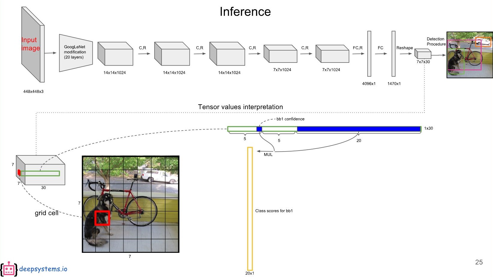 이 98개의 class specific confidence score에 대해 각 20개 클래스를 기준으로 non-maximum suppression(NMS)을 하여 object에 대한 class 및 bounding box localization을 결정합니다.