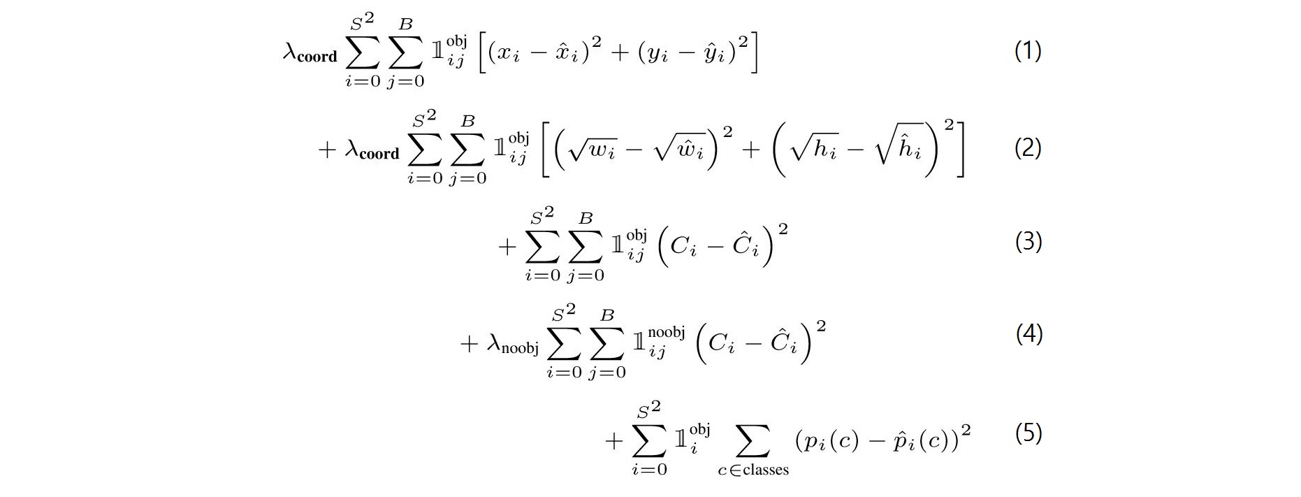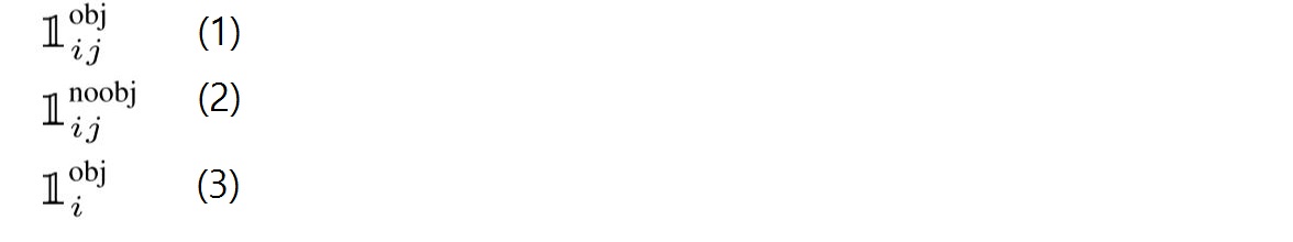 - (2) : grid cell i에 object가 존재하지 않음/ cell i에 있는 bounding box j