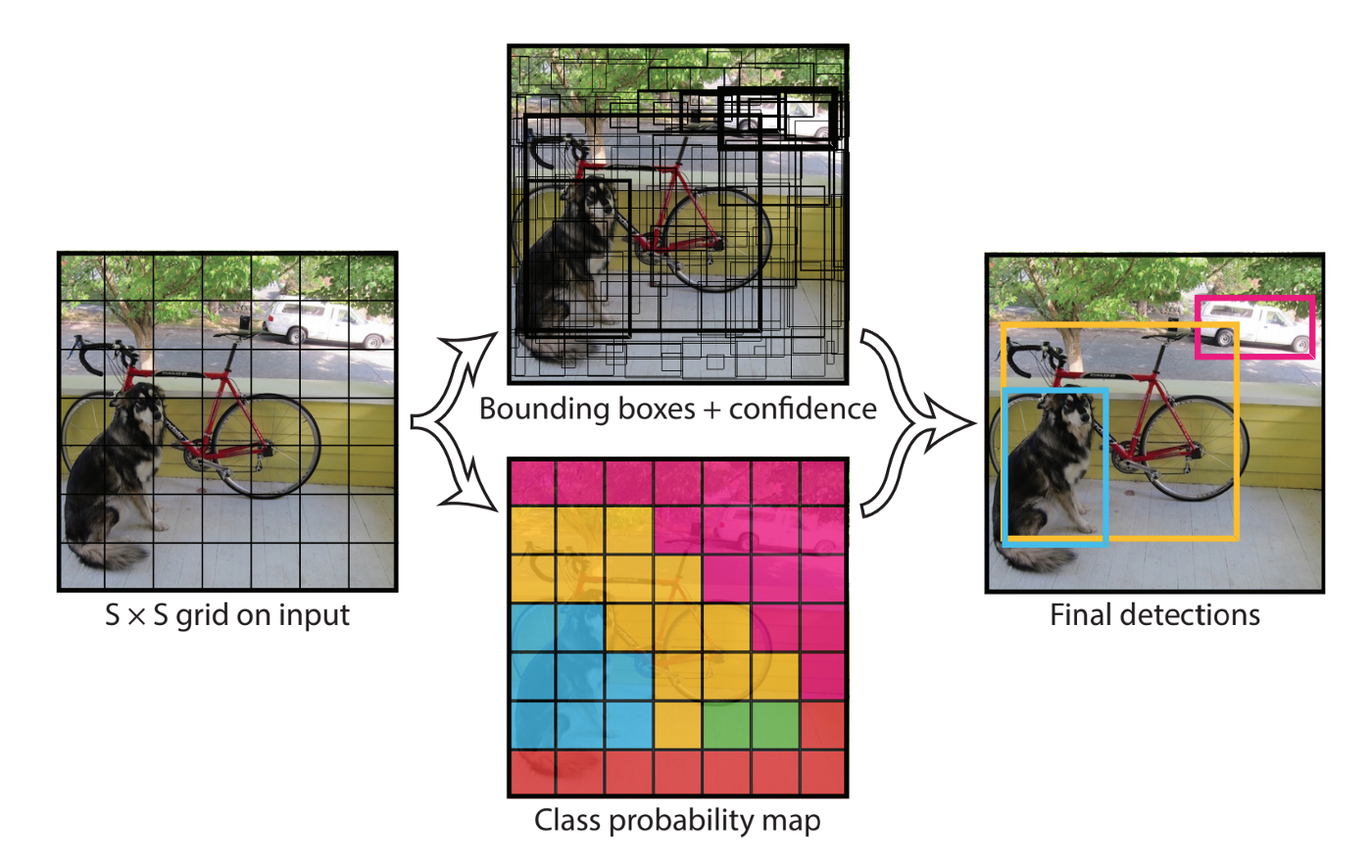 YOLO는 이미지 내 bounding box와 class probability를 single regression problem으로 간주합니다. 그래서 이미지를 한 번 보는 것 만으로 object의 종류와 위치를 추측할 수 있습니다. single convolutional network를 통해 여러 개의 bounding box에 대한 class probability를 계산합니다.