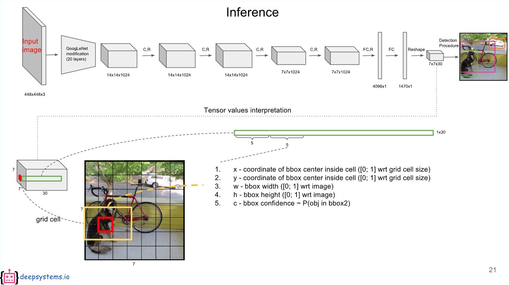각각의 grid cell은 7x7개, 즉 49개입니다. 각각의 grid cell은 bounding box가 b개 있는데 위 이미지 기준 b=2입니다. bounding box에 대한 정보로 x, y, w, h, c 값이 채워져 있습니다.