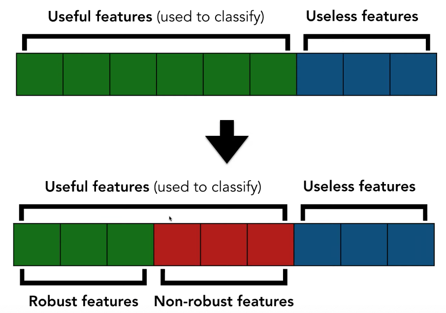 - ml에선 robust useful feature 뿐만 아니라, 사람이 인지할 수 없는 non-robust useful feature도 사용하여 학습을 한다.