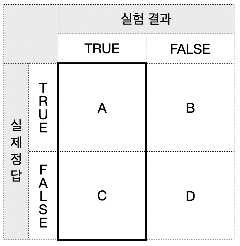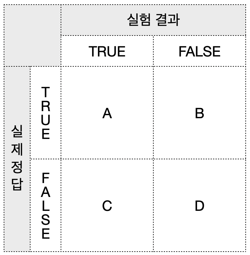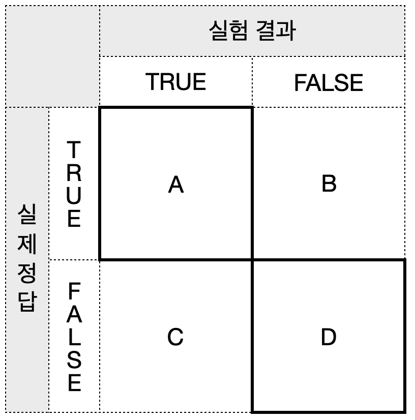 - D : 실제 정답이 False & 실험 결과 False (FF)
